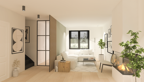 On the ground floor, the kitchen plays an important role as a 'social hub', but the seating area also offers space to relax. The patio doors give a view of the garden, which will become an important part of the house.